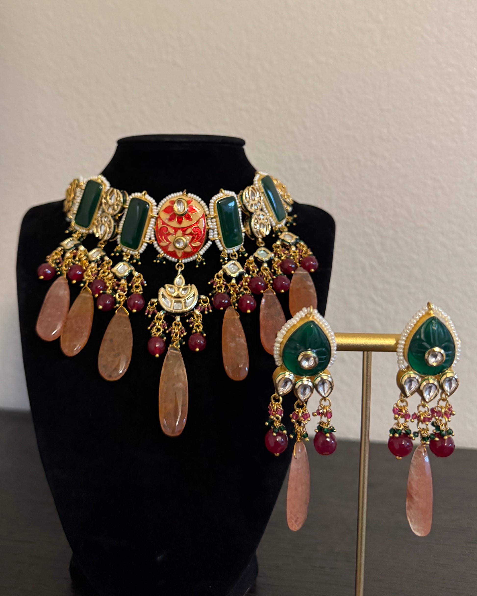 Regal emeralds, blush droplets, and kundan brilliance unite in The Emerald Court — a choker designed to rule every room with quiet magnificence.